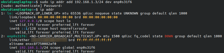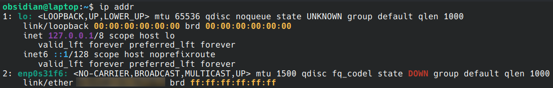 The second interface labelled enp0s31f6 now has an IP address (see purple) attached to it.