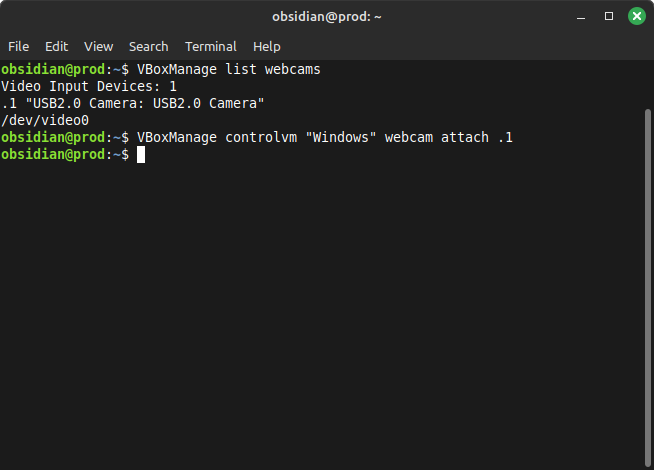 Now finally we need to connect this webcam to enable passthrough. Issue this command, by replacing the word Windows with the name of your VM instance and the .1 with the number that corresponds to your webcam as listed in step 2 (in most cases, it should be .1):