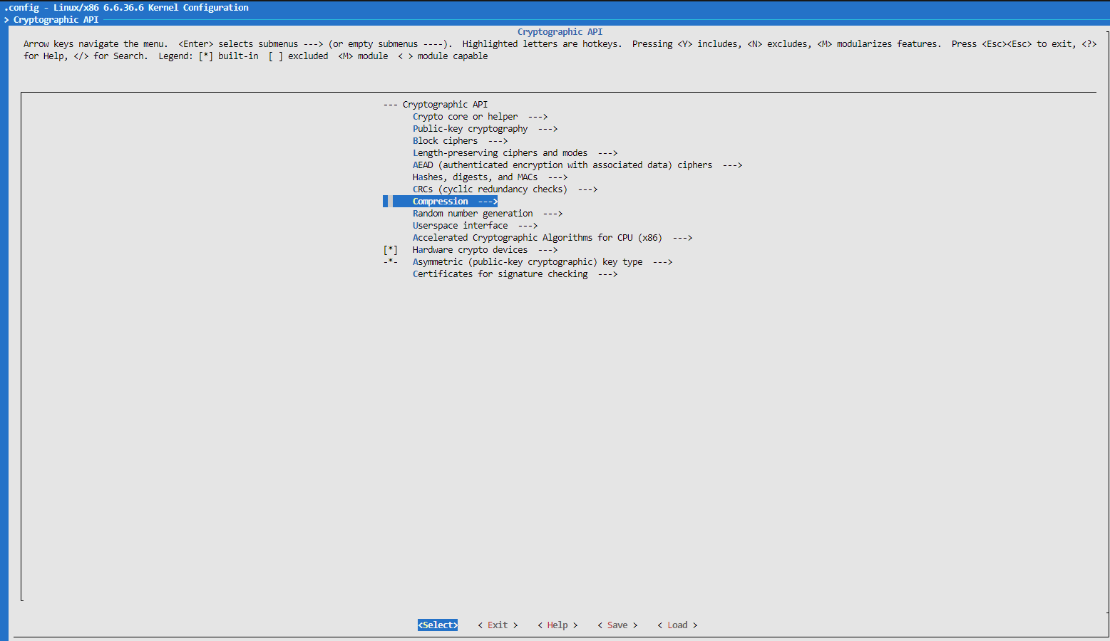 Make sure to change Compressed RAM block device support from M to *, if it was previously set to M. To change it, simply press Y at this option. M means a kernel module that can be loaded separately, and Y means that it will be built-in. In WSL2 Loadable module support is disabled when using a custom built kernel. We must set any modules to be built-in before building.