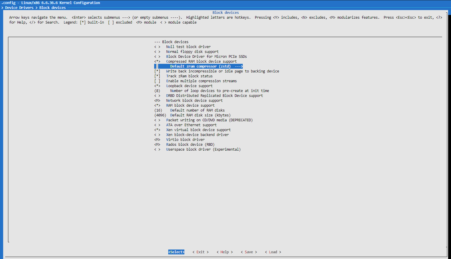 7) In this same place under Compressed RAM block device support, you can also set the compression algorithm via the submenu Default ZRAM compressor. I set it to ZSTD.